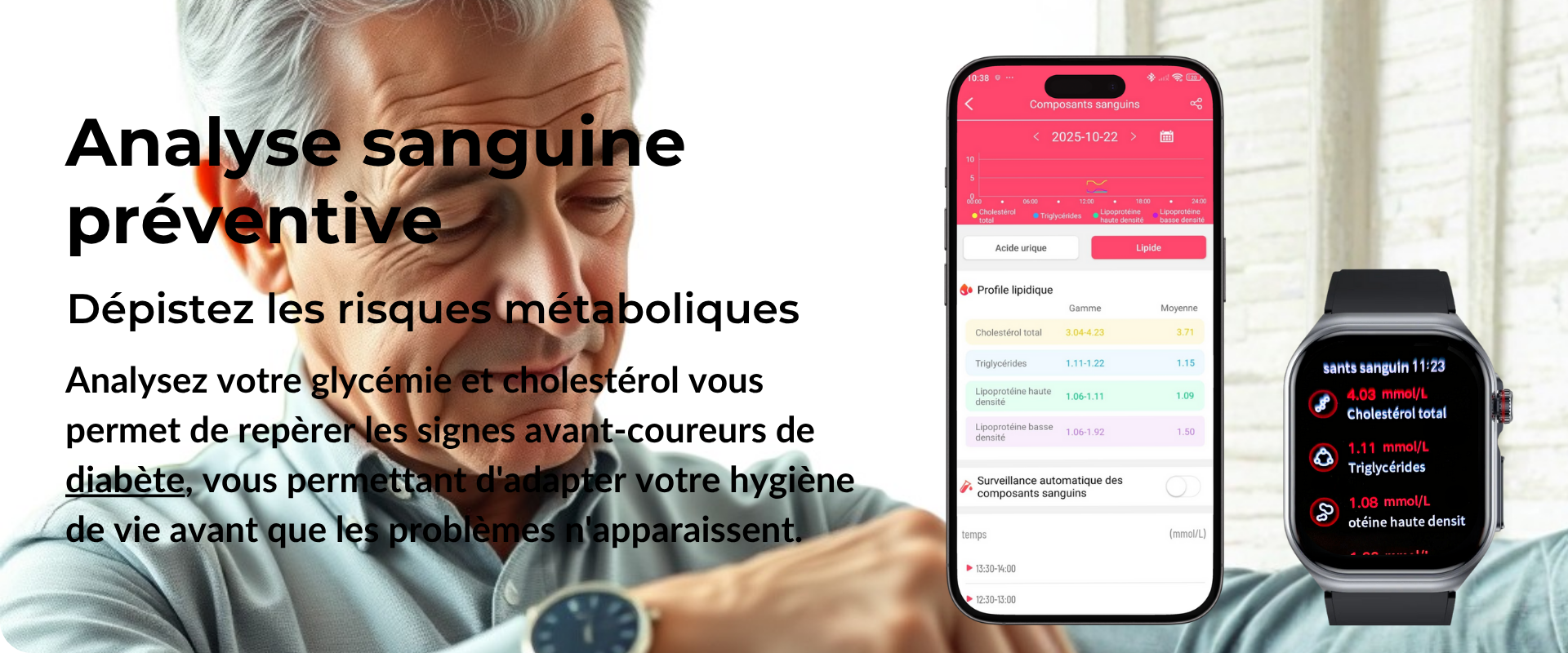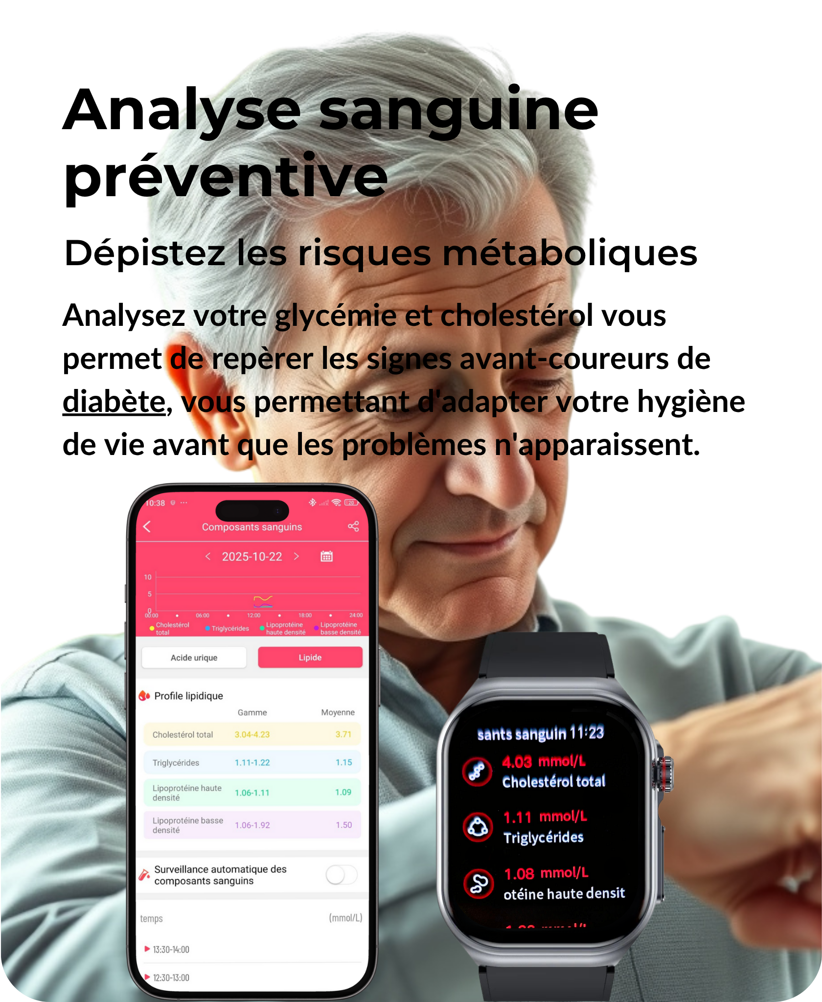 - Estimation glycémie/cholestérol : Évalue votre risque de diabète et problèmes métaboliques*