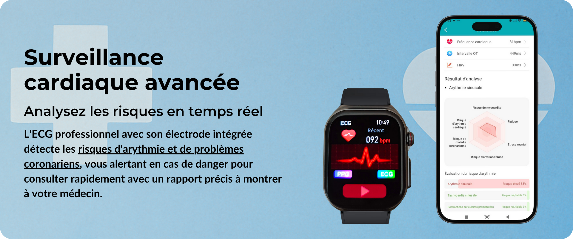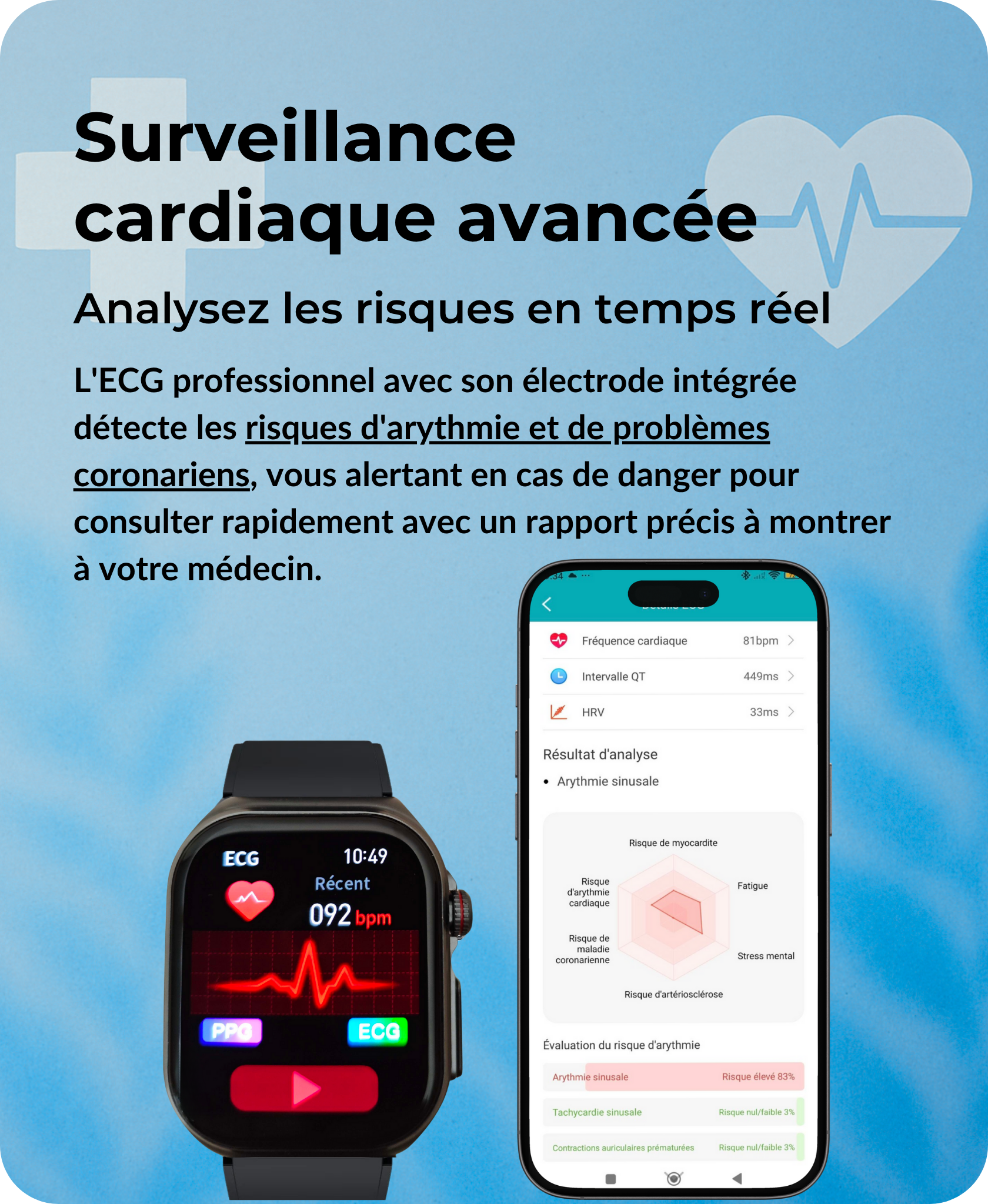 - ECG professionnel : Posez votre doigt sur l'électrode latérale pour évaluer les risques de myocardite, d'arythmie, et maladies coronariennes (nul/faible/moyen/élevé)