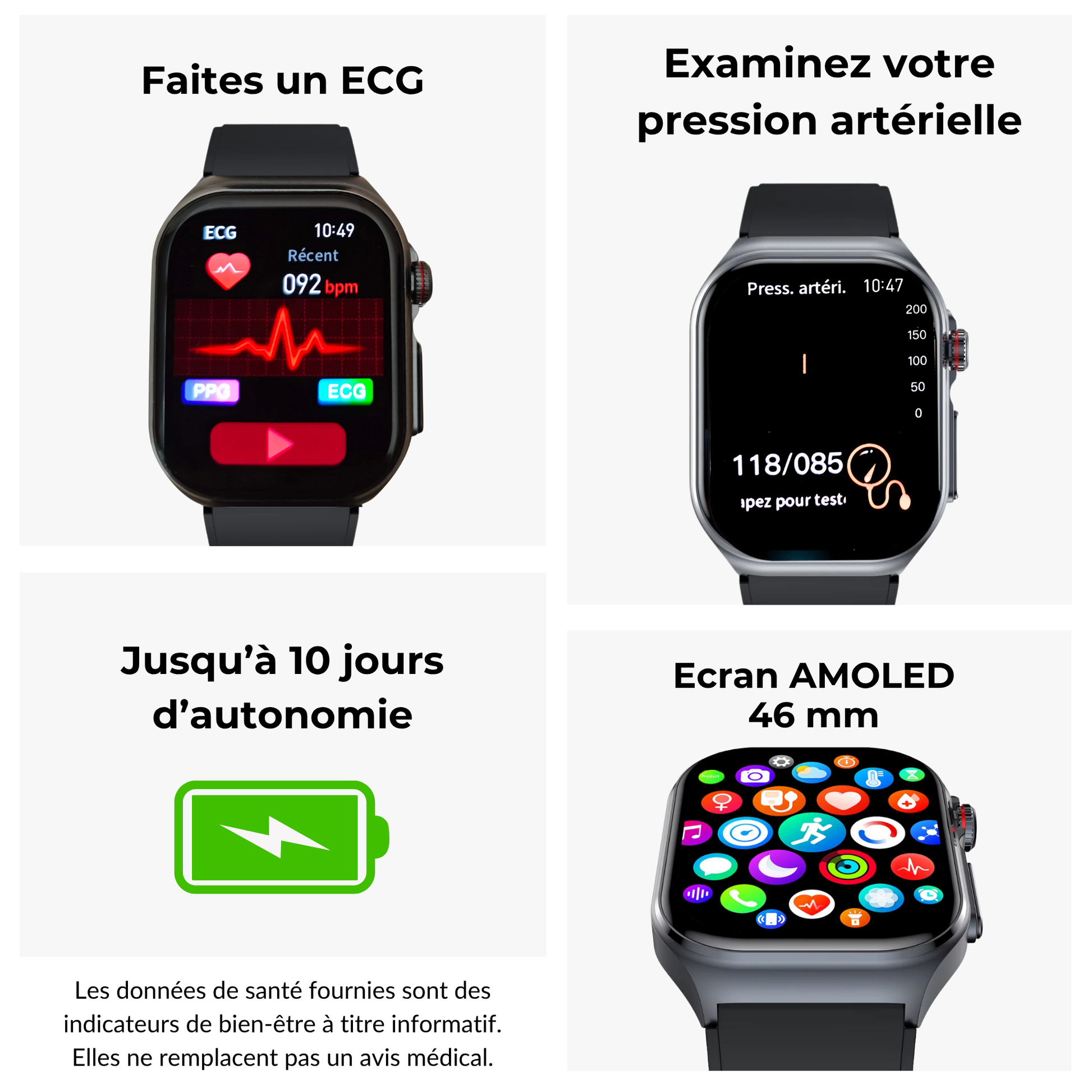 Montre Connectée Santé : avec ECG, Analyse Corporelle (Acide Urique, Masse Graisseuse, Musculaire), Mesure de la Fréquence Cardiaque, SPO2, Surveillance du Sommeil, Pression Artérielle, +100 Modes Sport, Notifications Appels/Message, Écran AMOLED 46mm, Autonomie 10 Jours, Étanche IP68.